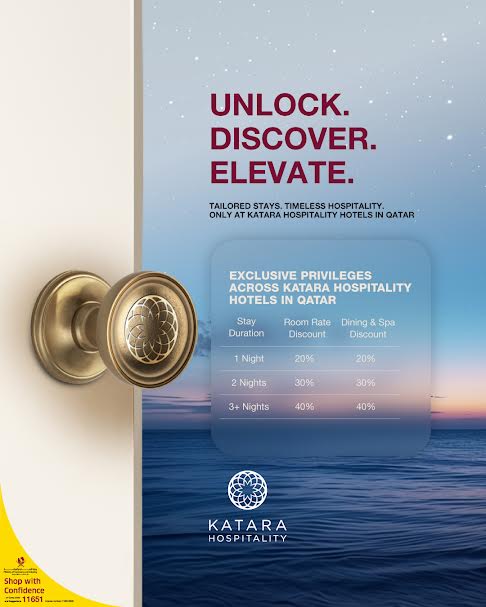 يستمر العرض لغاية 31 أغسطس 2025، ويدعو الضيوف للانغماس في تجربة إقامة مصممة خصيصًا مع خصومات وامتيازات حصرية تضمن تجربة لا تُنسى. وتؤكد هذه المبادرة التزام كتارا للضيافة تجاه المجتمع المحلي وتفانيها في تقديم تجارب ضيافة استثنائية.